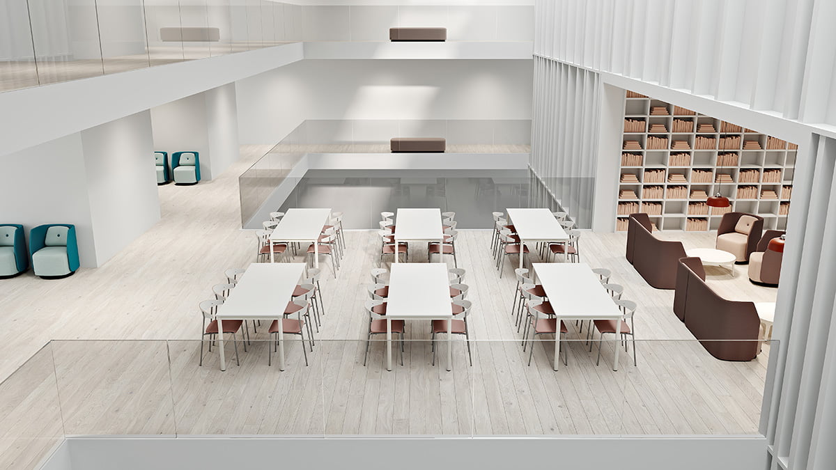 Each space was designed as a narrative — from open collaborative areas and learning environments to quiet focus zones and social hubs. The interiors were intentionally kept minimal and architectural, allowing the furniture to take centre stage while still creating distinct atmospheres through colour, materials, and light.